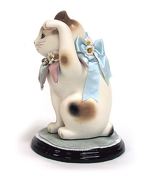 若手ビスクドール作家として注目を集める岡馬氏の招き猫…その、やわらかく透き通るような肌合いは、ビクスならではの魅力だ。