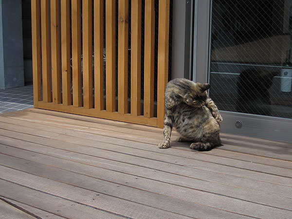 この一週間、全国各地でゲリラ豪雨が続きましたが、皆様ご無事でしょうか。 雨が降り続き、外気と触れられる唯一のスペース、ウッドデッキにも出られない猫たちが、苛立つのも無理はありません。 |