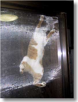 ムササビ状態のトンちゃんのお腹、なかなか可愛らしいでしょ。 こうして網戸は役立たずになっていくのです。 |