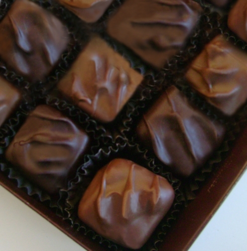 The Artful Chocolatier のバレンタイン・チョコレート。同社はチョコレートと箱のコラボレーションで知られている。チョコレートは Wendy Bathのもので、キャラメルをヨーロッパの良質チョコレートにハンド・ディップしてある。箱の猫の絵は、Donna Goeddaeusの作品。