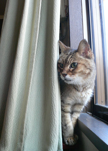 またまた、ご無沙汰しました。春を迎えるのも20回目だけど、春はなんとも言えずいい気持ち。気持ちも若返るわよねえ。カーテンの陰からそっと覗く、なんてポーズも、春の陽射しがあればこそ。皆さんも、存分に春をお楽しみくださいね。