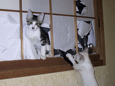 へへ、障子とガラス戸の間に入って遊べるのは、ぼくたちだけだもんね。