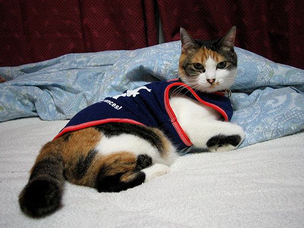 どう、似合う?これ、あたしのパジャマなの。夜寝る時にね、パパちゃんがエアコンつけるのよ。あたし、あの冷たい風が嫌で、寝る場所をうろうろ探してたの。布団の中にもぐるのも嫌だしね。そしたら、パジャマ買ってくれたってわけ。