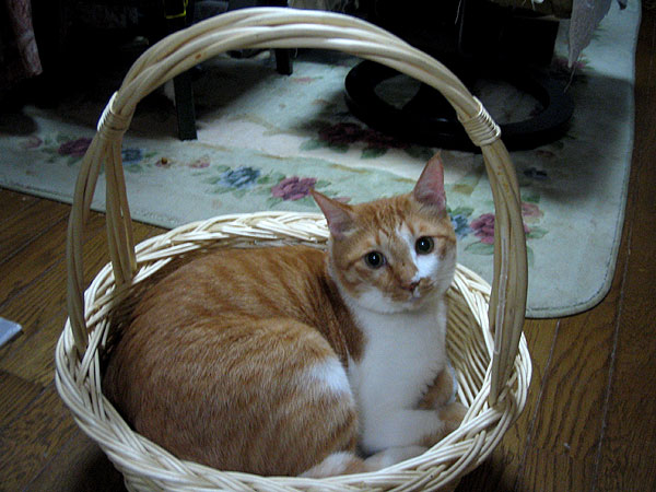 ぱぱちゃんが、すっごーい果物のバスケットをいただいてきたの。中身は人間にあげるけど、バスケットはあたしの!エリちゃん