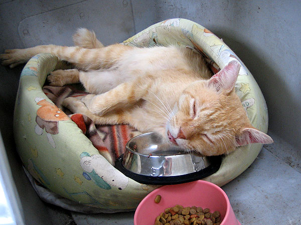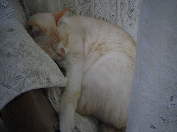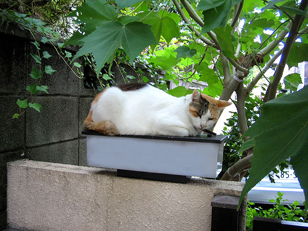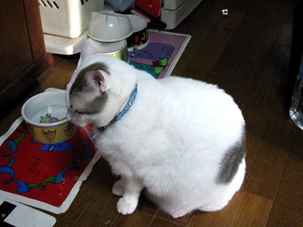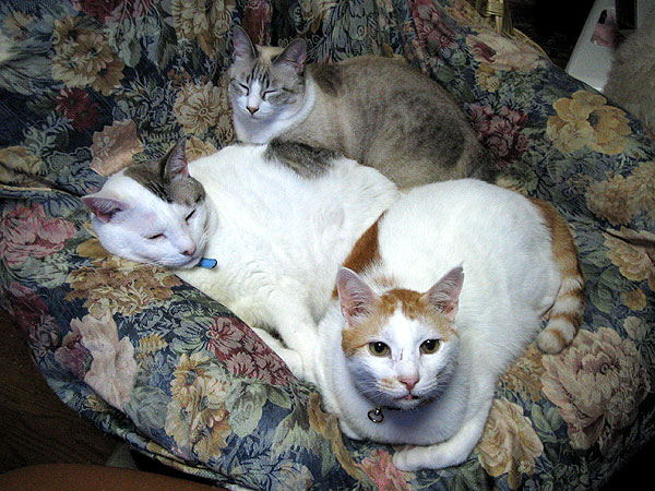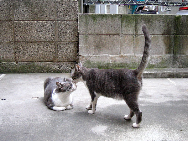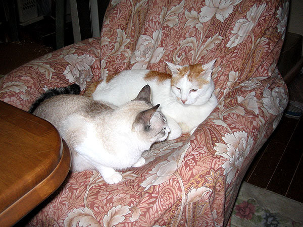 らー:ぼく、白い猫と一緒なら安心なんだ。茶トラはどうも苦手でさ。見て、ぼくの鼻。この傷も茶トラのトンちゃんにやられたんだよ。白い猫(白が多い猫ってことだけど)は、やさしくて、大好き!