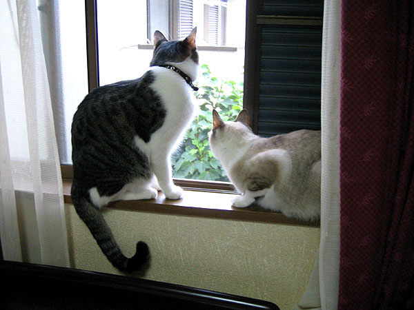 せっかくカーテンを巻き付けて、ぼくの憩いの空間を作ってるんだから、覗かないでよ。