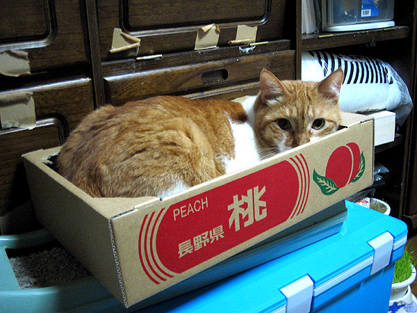 ぼく、『桃から生まれた桃太郎』じゃなくて、ごんちゃんで〜す。後ろの棚のガムテープ、気になる?棚が届いた日に、トンちゃんが、全部壊したんだよ。ぼくのせいじゃないからね。