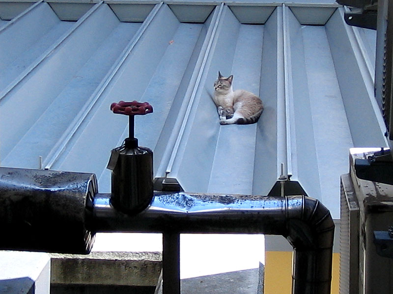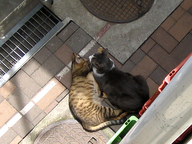 ズレータがのんびり春の陽射しを楽しんでいるのは、お隣のお好み焼き屋さんの屋根。昨年新築された建物だ。ここには、以前ロッキーママが飼われていた中華屋さんがあった。その後100円パーキングになり、そして今度はお好み焼き屋さんと目まぐるしく様変わりしている。取り壊しや建築期間も含め、猫たちは絶えず環境の変化に脅かされ、落ち着く間もない、と気を揉んでいたが、猫たちは、したたかに、それぞれを受入れ、有効利用している。猫たちの方が、はるかに生き方上手らしい。