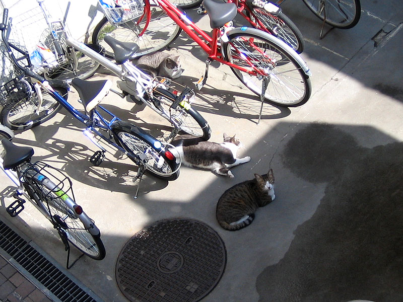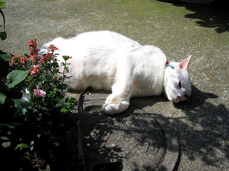 春うららの昼下がり、排水管にもたれて、手足を投げ出すあっちゃん。閉じた瞼の裏側には、どんな光景が去来しているのだろう。あまりの無防備さに、声を掛けるのも憚れる。2階のバルコニーから撮った一枚。