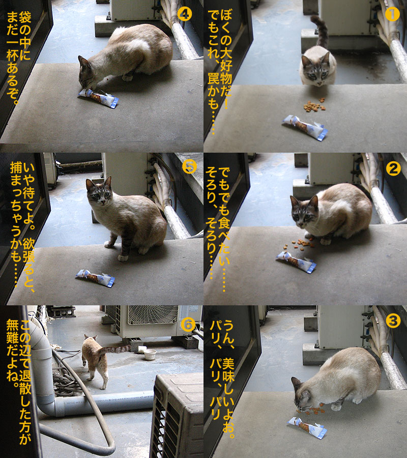 事務所の南側のバルコニーにはエアコンの室外機が並んでいるが、その配管に巻いてあるテープがぼろぼろになっている。人知れず猫さんがやって来ては、爪を研いでいる模様。その犯人は、ズレータだったようだ。近頃は、バルコニーにやって来て、鳴くようになった。そして、ついに……