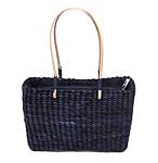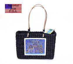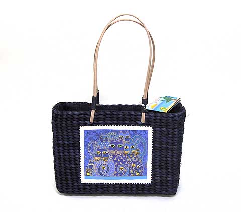 藍染めのような落ち着いた色調のストローバッグ。表面には、ゴールドで縁取られたローレル・キャットをあしらった布が縫い付けられています。横長のデザインで、開口部も広く、使い勝手の良いバッグです。