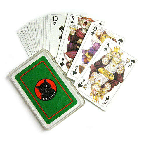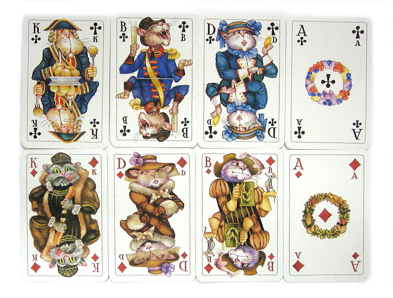 絵札とAにピーター・ベッカーの素晴らしいイラストが描かれた、ドイツ製のデックです。キングとジャックの諸氏は飲んだり、食べたりがお好きな様子。クィーンが澄まし顔で眺めています。数字の札も、お洒落です。